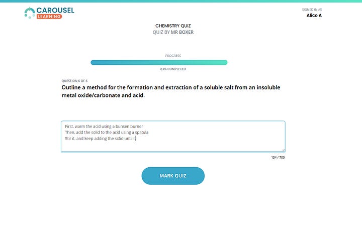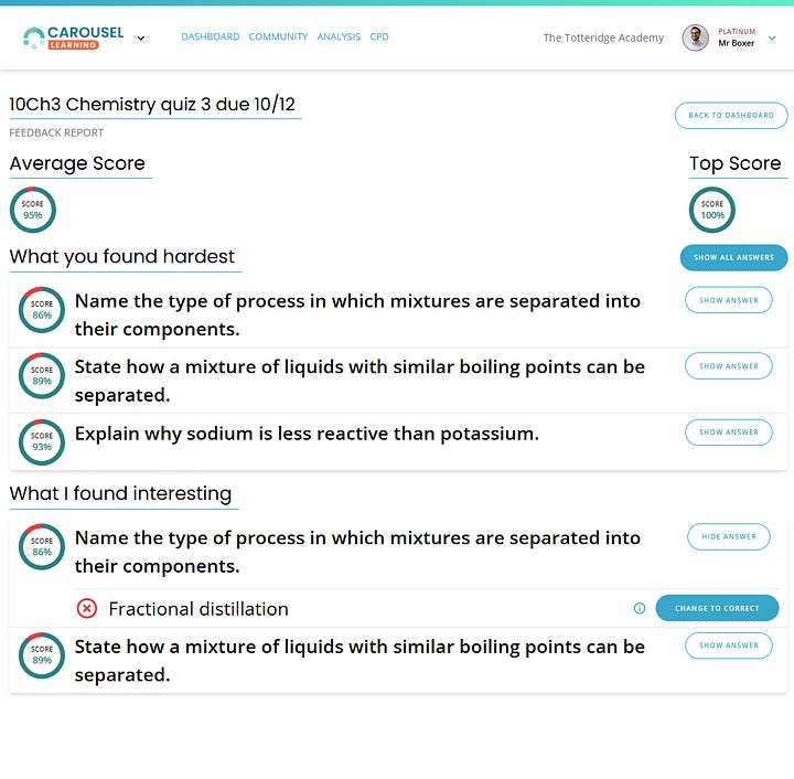 Tom’s objection was simple. As a department, we had a strong policy for long-term memory and retrieval over time. It involved students using Carousel Learning flashcards and then completing a free-response quiz. They self-assess their quiz, and we would moderate their assessments. A typical student would be answering hundreds of questions a year at home, and we buttressed that with Whiteboard quizzes in class (another ~8 questions per lesson) and feedback based on what we saw in their homework.