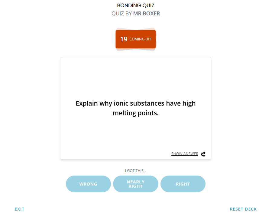 Quality retrieval, every time: teachers know that students are answering lots of the right questions, lots of times. Because students are held to account for their performance in a subsequent quiz, they are incentivised to take the retrieval seriously.