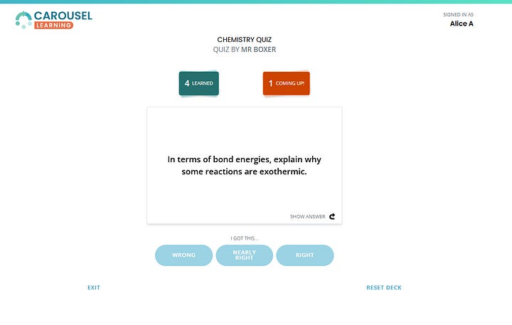 He moves on to the next one, and again writes down his answer. He flips the card, but sees he got it wrong in his written answer, so marks it with a cross in his exercise book, and clicks “WRONG” in Carousel. He does the next card (right) and the next (right) and then the one he got wrong appears again. He gets it right this time, so ticks it, and clicks “RIGHT” in Carousel.